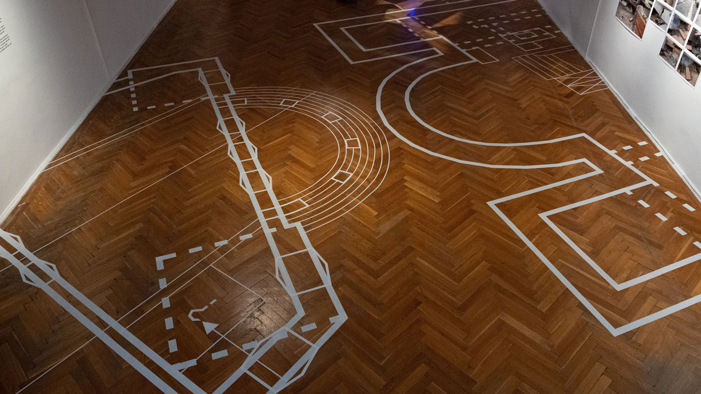 As part of the installation, the tape artist Atau Hámos (www.tapeartatau.com) has used white tape to mark, in a reduced scale, the floorplans of both buildings on the floor of the Csók István Képtár gallery. The floorplans are marked in such a way that the exhibition space is divided into two parts.