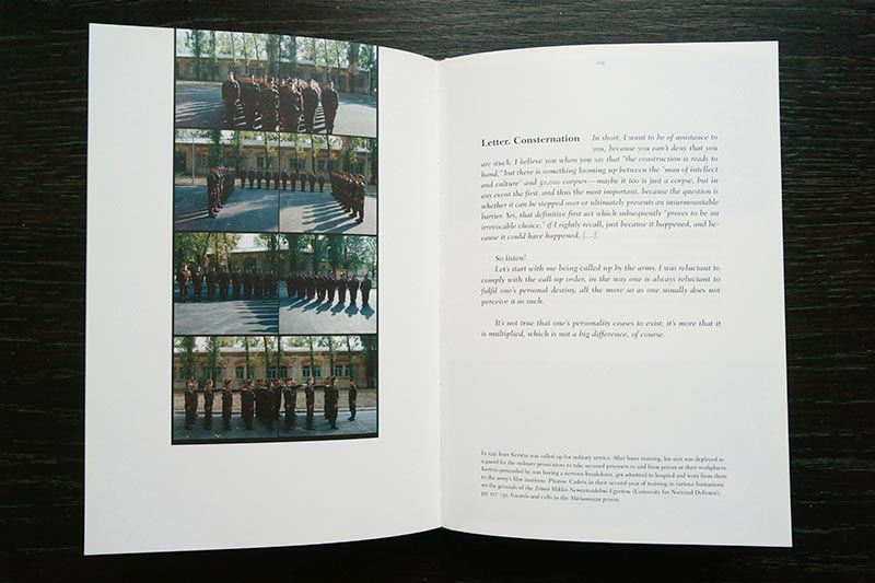 The photonovel transforms Imre Kertész’ literary method into a visual language: by joining fragmentary elements from the past and the present, by finding traces that link experience and remembering. The book with its filmic images moves the «reader» to think movement; by flicking through the book, the editing, the montage is effected through the reader’s exploration of it.